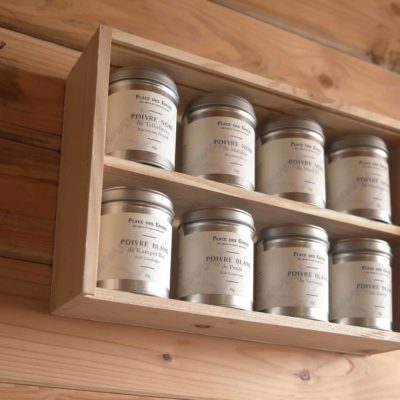 Ce coffret de 8 poivres de 32 x 22 cm se transforme en étagère grâce à son couvercle escamotable et ses attaches dorées qui vous permettent de l’accrocher dans votre cuisine. 4 poivres blancs et 4 poivres noirs, 8 boites de 50g de différents poivres pour commencer à découvrir l’univers des piperophiles. Détail du coffret un peu plus bas.