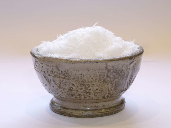 Sel de terre du désert ouest égyptien, le désert libyque, dit le désert blanc, à quelques kilomètres de l’oasis de Farafra sur le chemin de Baharya. Ce sel vieux de plusieurs millions d’années se cache sous le sable du désert et forme des veines de quelques mètres. Il se présente sous forme de paillettes longues, comme des cheveux cristallins, il est très aérien et ressemble à des cristaux de neige.